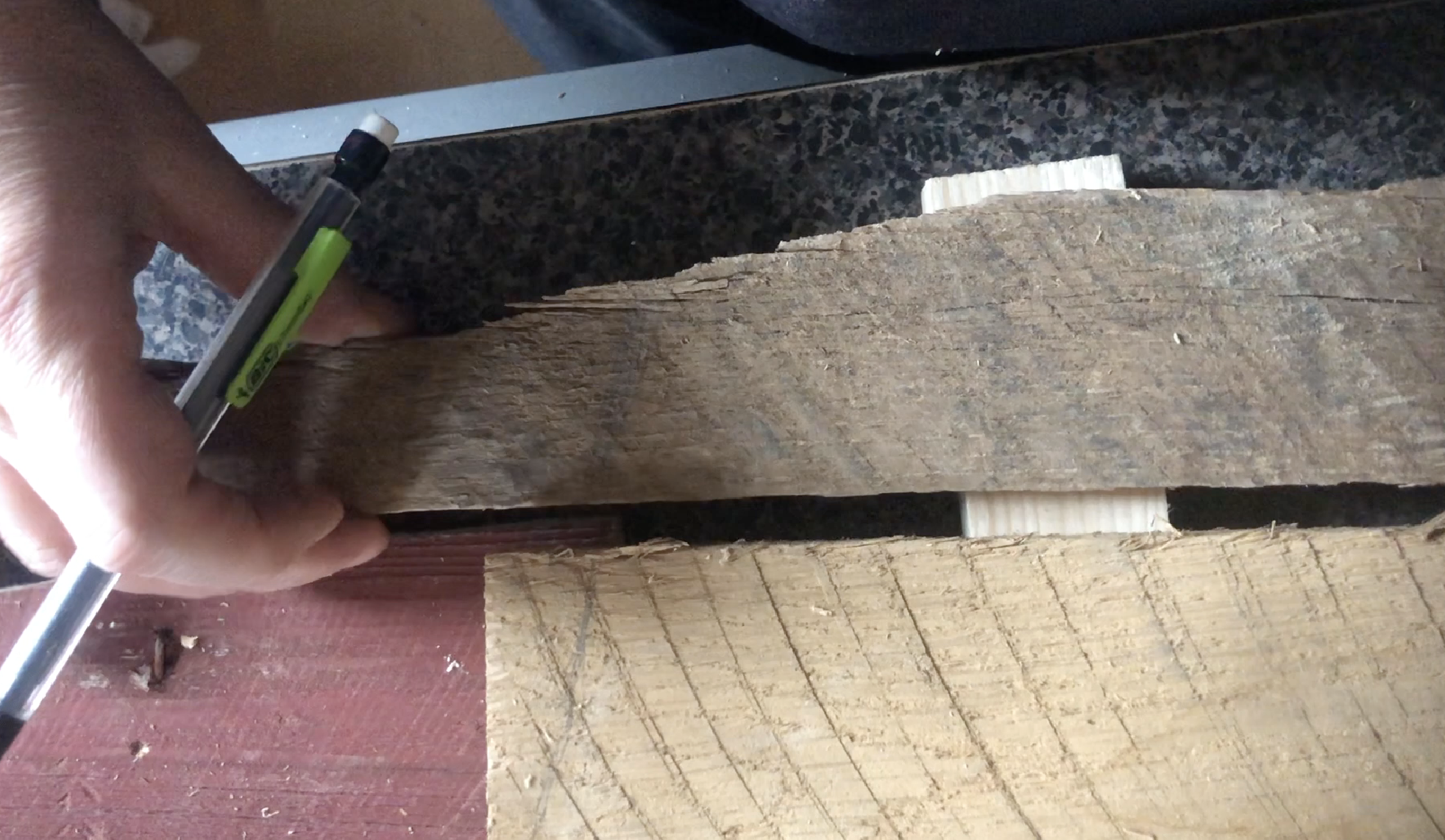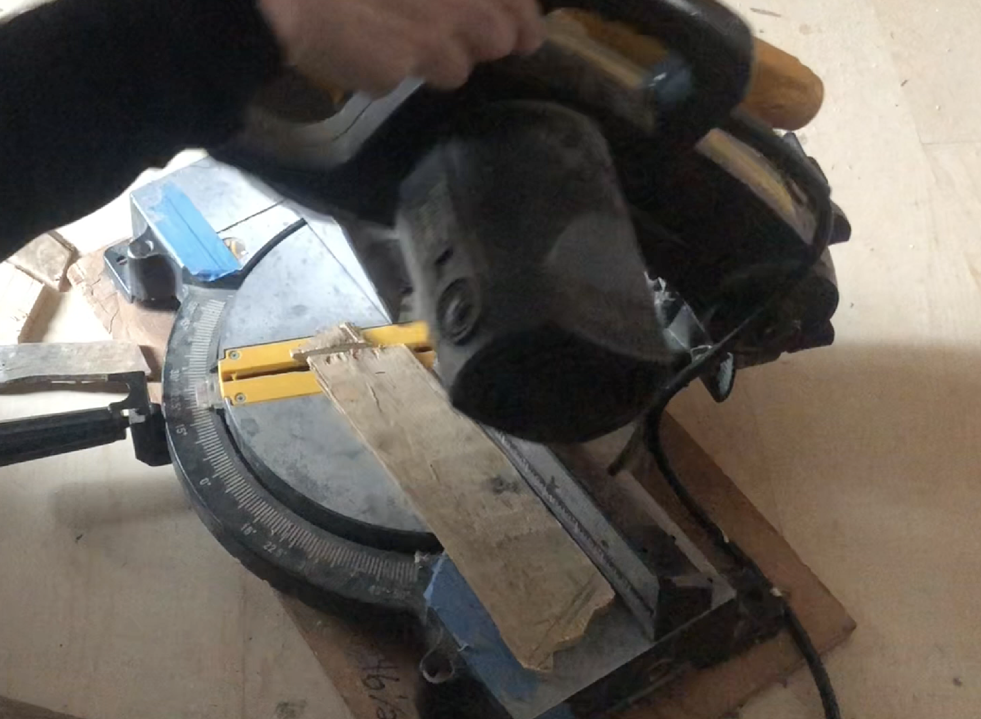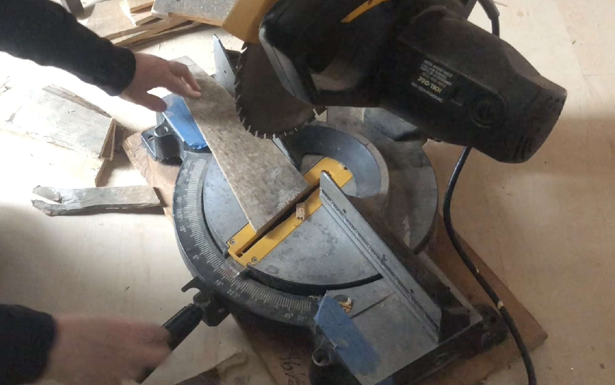 With a pencil, you’re going to want to mark the angle in which your board should be cut, making the boards smaller as you go up. This doesn’t have to be perfect, because we will be using an exact measurement on the miter saw.