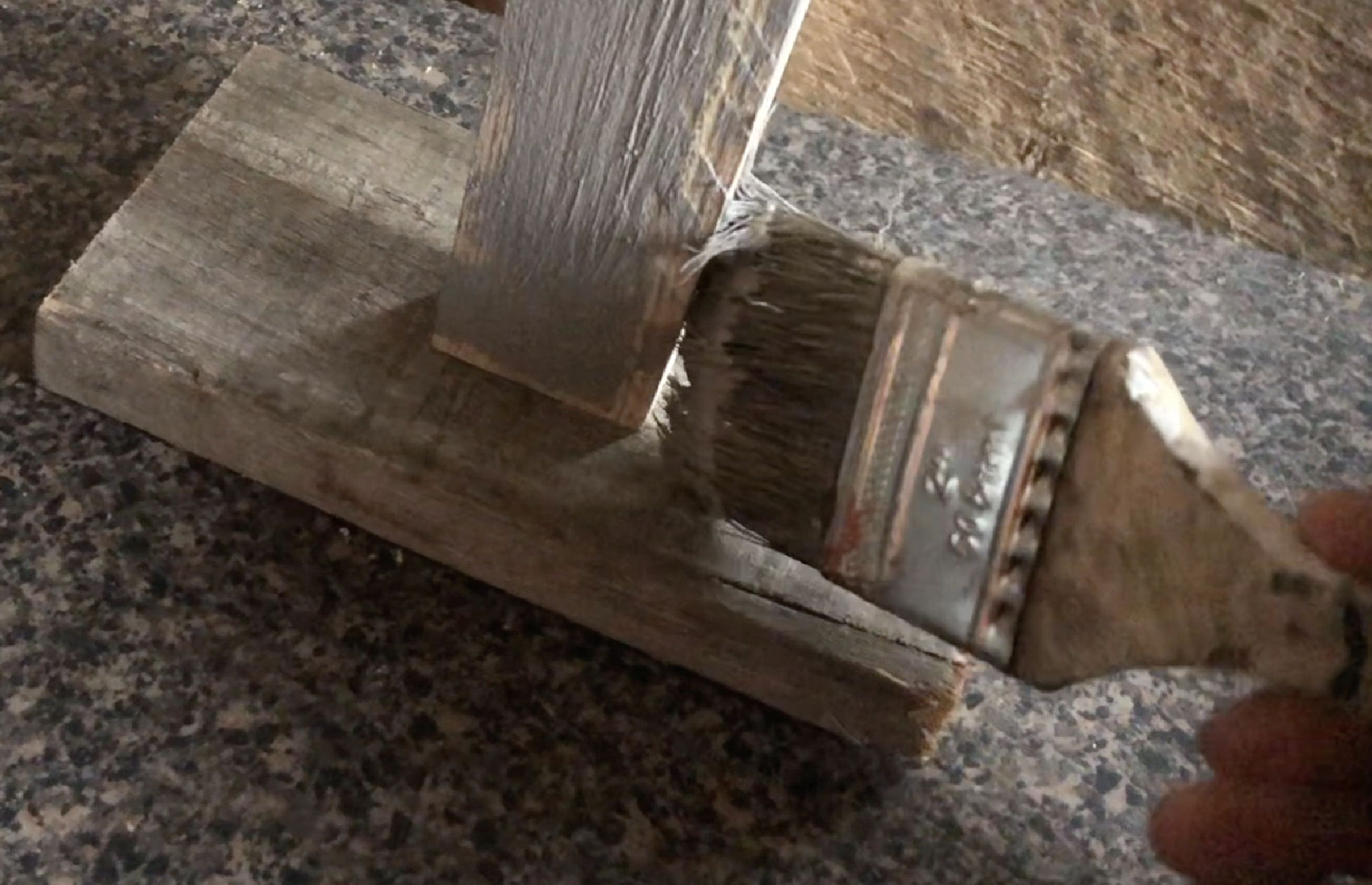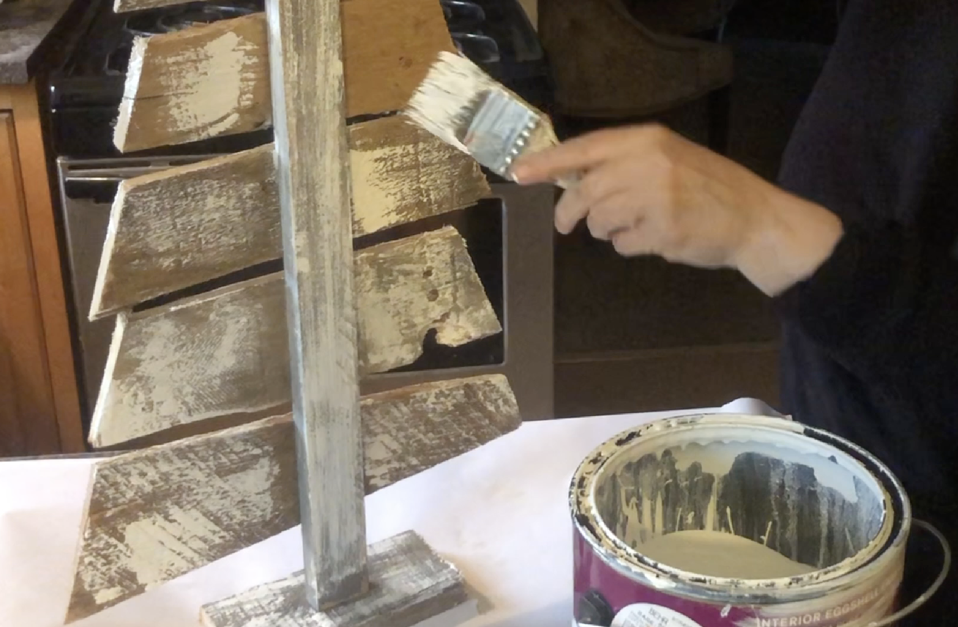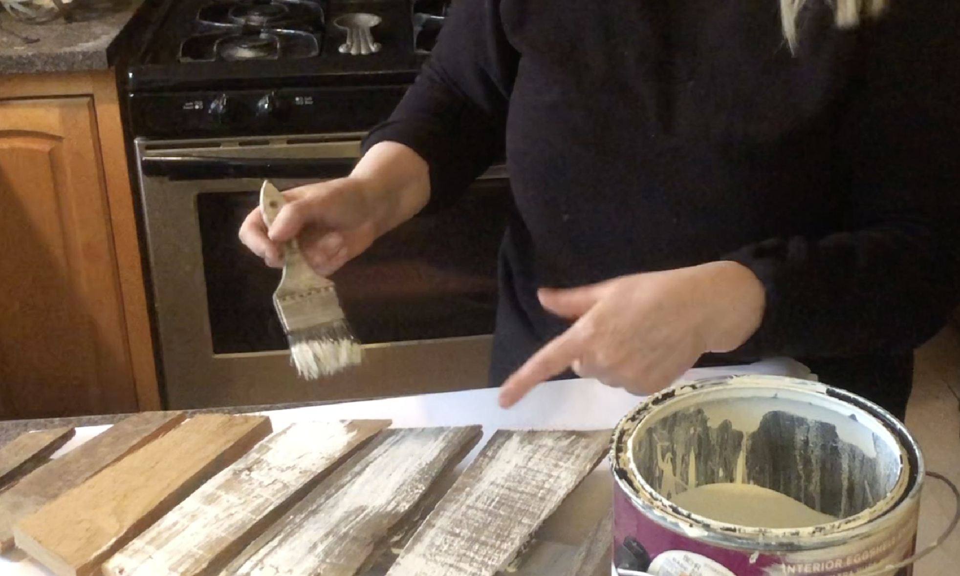 Using some Behr white paint that I had, I went over the boards lightly….making sure to miss spots as I drug the brush across. This is what you want it to look like.