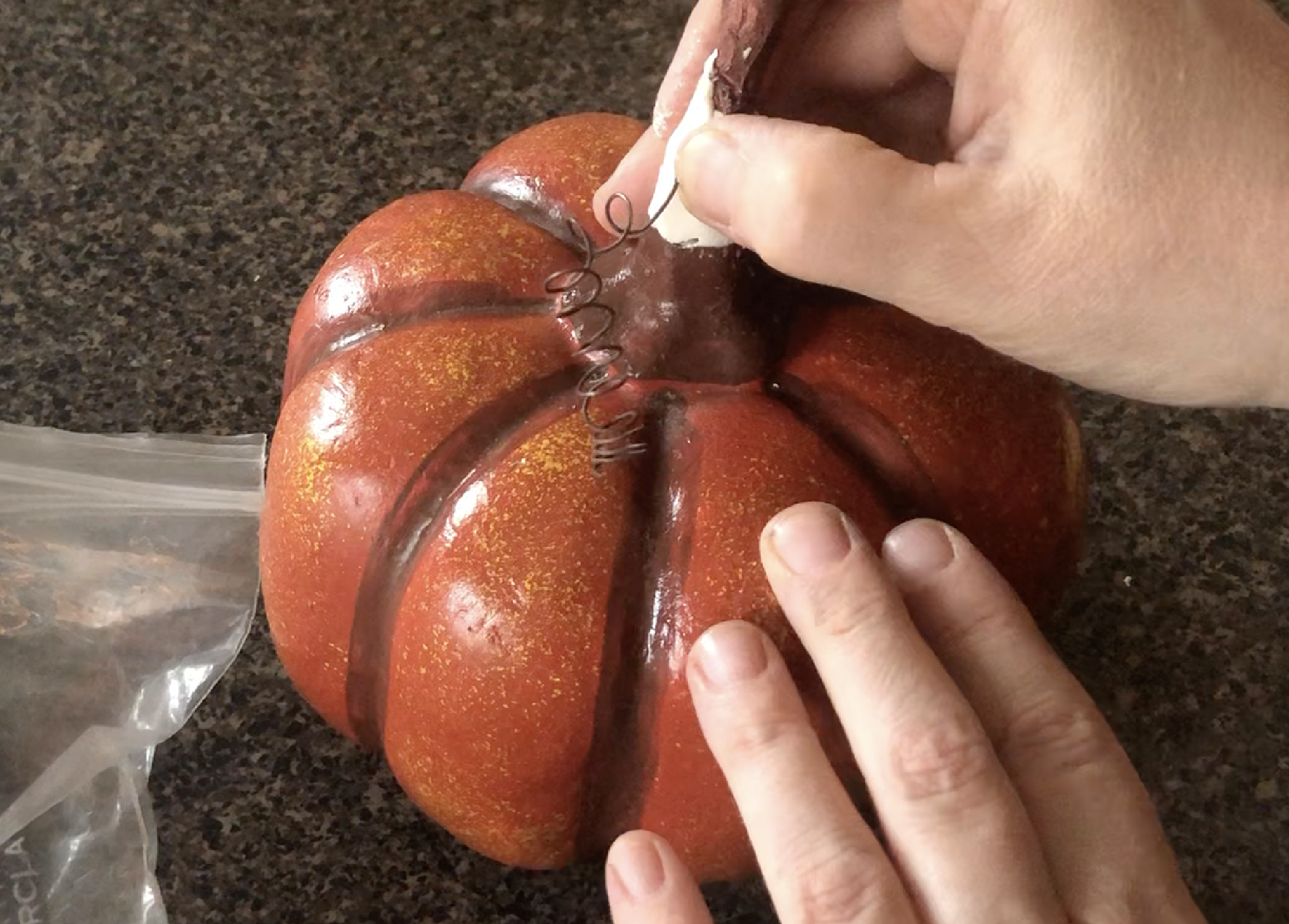 After I removed the raffia…I found out that the stem had a piece missing and that the raffia had actually been hiding the damage. I took some Creative Paper Clay and molded it over the stem to fill in the missing piece. I then let that dry.