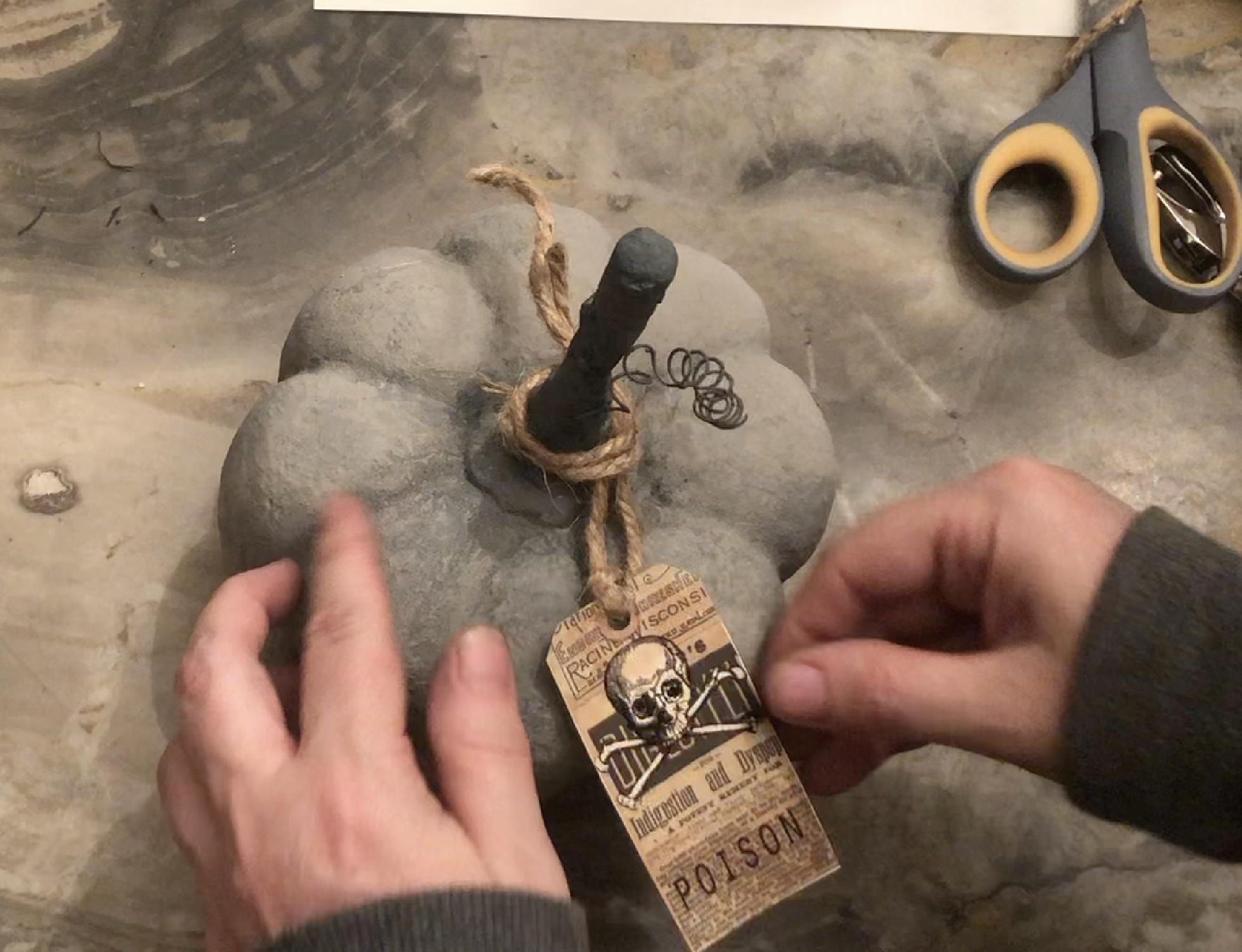 I then added a hang tag to it to give it a more finished look. I love how this came out! It’s hard to believe it’s the same plastic pumpkin I bought at the thrift store!
