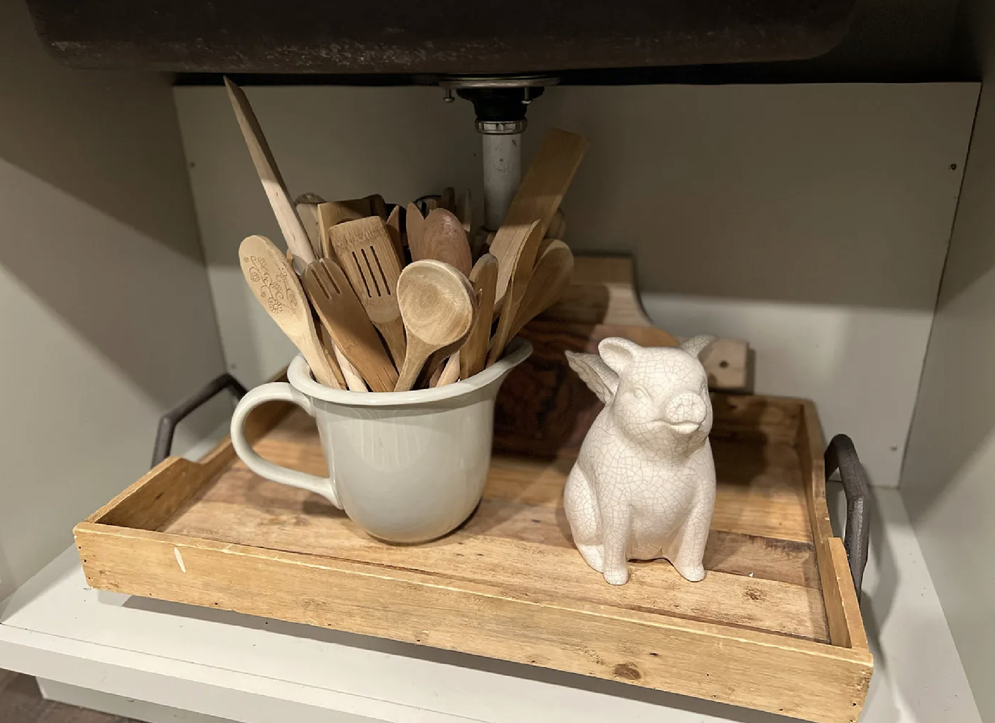 Anyway, just a little back story…..how Debbie got started collecting flying pigs is after her sister said, “Well, you can come over and clean my house.” Debbie replied, “When pigs fly!” and that’s when she started to collect flying pigs. She has a number of flying pigs…they all are so cute! I love the one that she has next to a pitcher with wooden spoons in it.